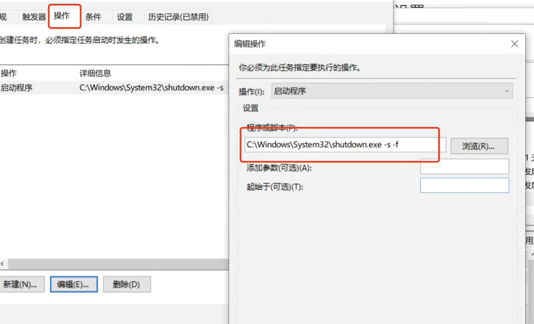 3、增加定时任务 (参数 -s -f 0)立即强制关机